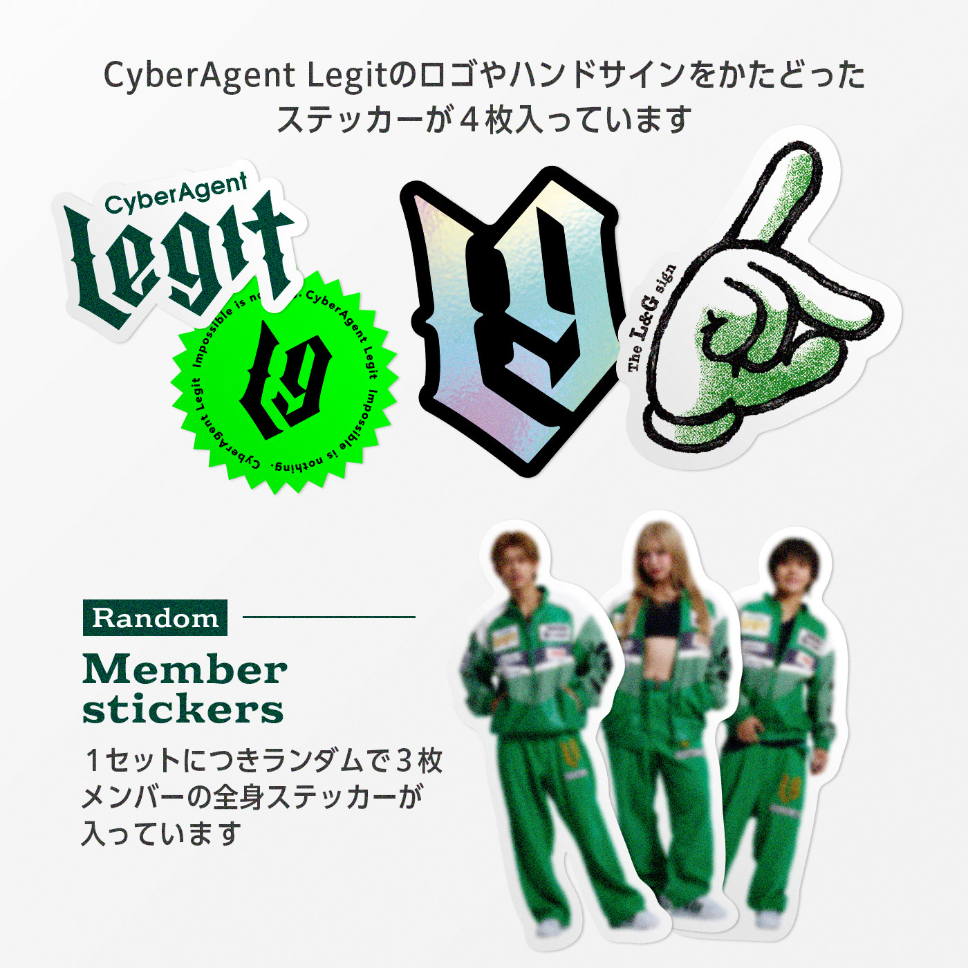 CyberAgent Legitメンバーの全身ステッカーがランダムで3種入っています。